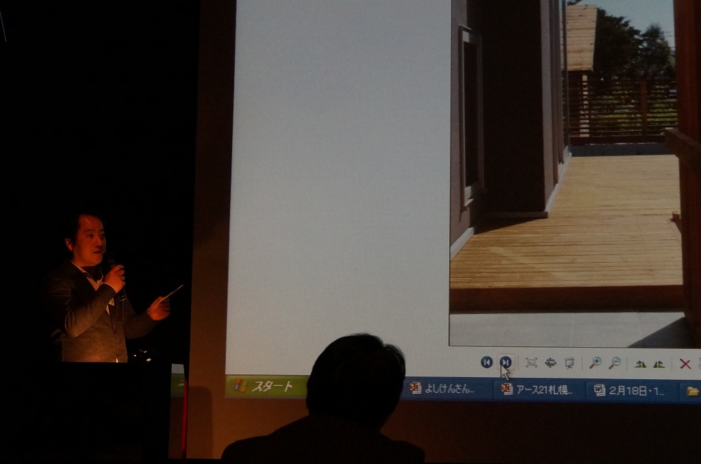 アシスト企画からは高橋氏から自宅の建築事案の紹介です、環境を生かし土間蓄熱や木製サッシなど実験としての要素も取り入れたものでした。