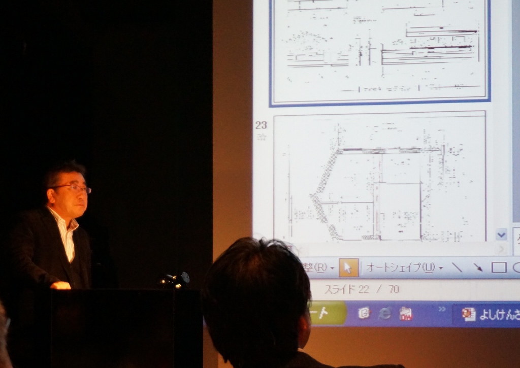 今回は現場に実際に行くのではなく、写真や図面を投影し会員の説明を聞くというスタイルでの現場公開としました。