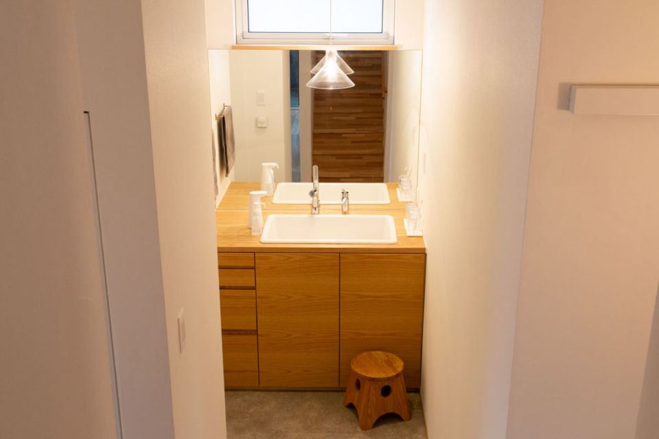 ガラスのペンダントライトは奥さんのお気に入りの一品。高窓からの光が優しい、明るい印象の洗面所に仕上がった