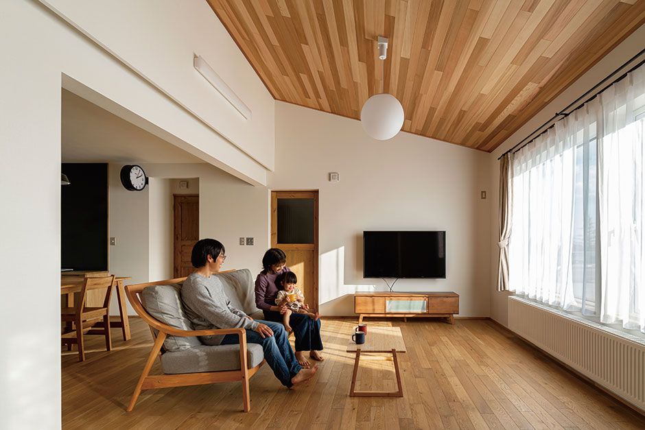レッドシダーを張った屋根なり天井が心地よい広がりをつくり出すリビング。壁付けテレビの下の収納は造作。家具も、木質感あふれる室内の雰囲気に合わせて選んだ