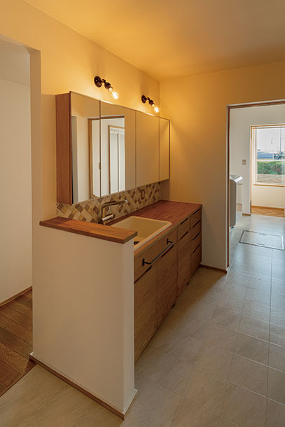 造作収納を設けた洗面台には、奥さんが選んだタイルや照明を採用。「内装は思っていた以上に造作が多く、満足度の高い家づくりができました」と奥さん